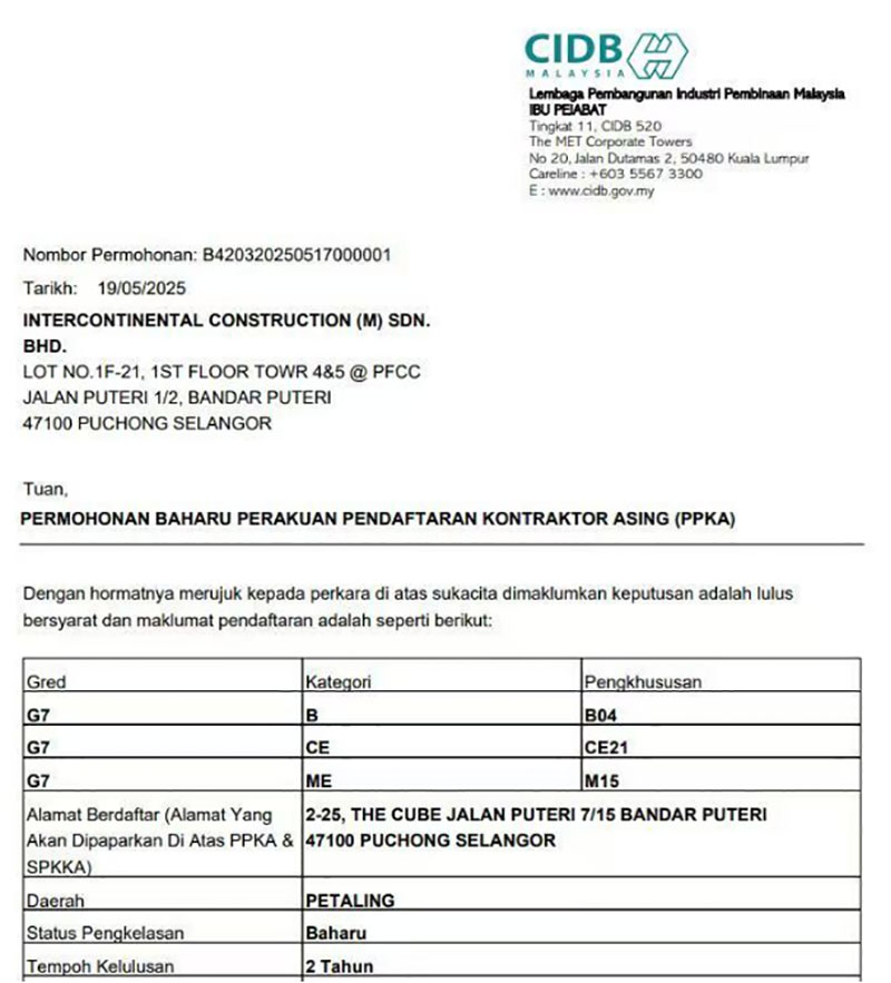 此次取得的G7施工資質(zhì)是CIDB許可的“競(jìng)標(biāo)能力”價(jià)額無封頂、無上限的施工資質(zhì),意味著今后洲際建設(shè)在馬來西亞承接工程將不再受項(xiàng)目規(guī)模、合同金額以及類型限制。